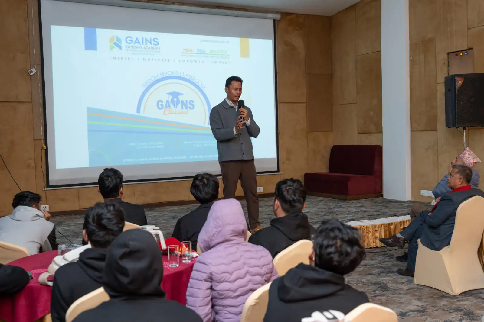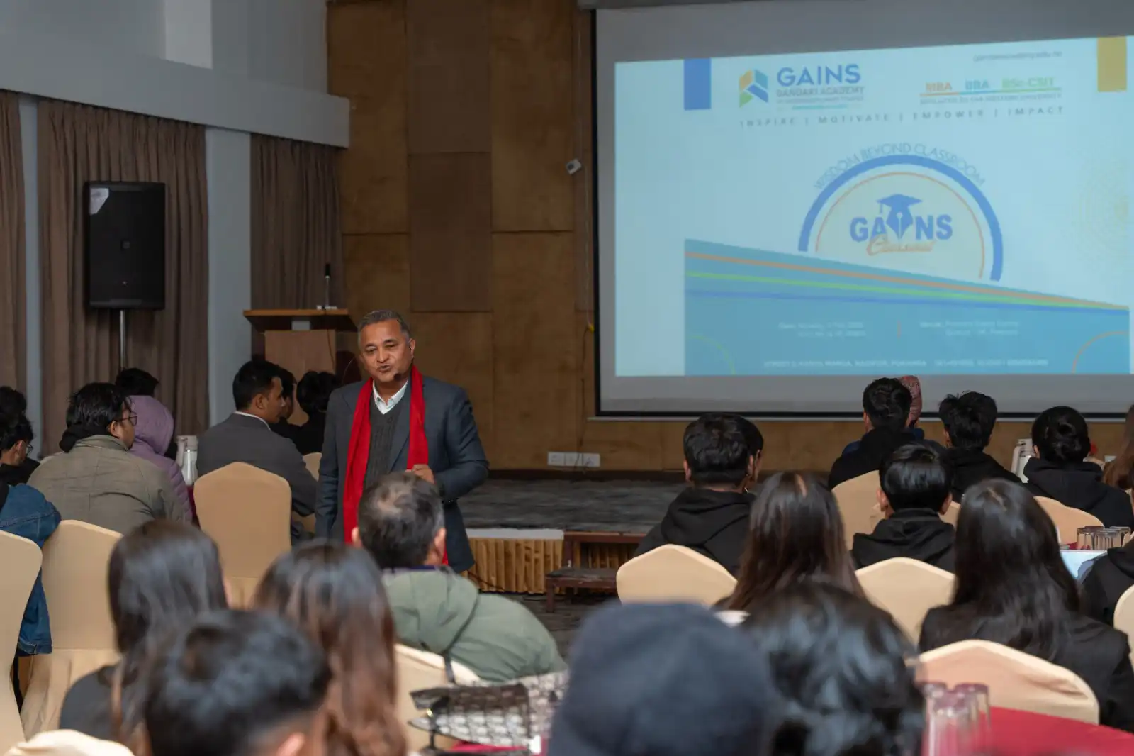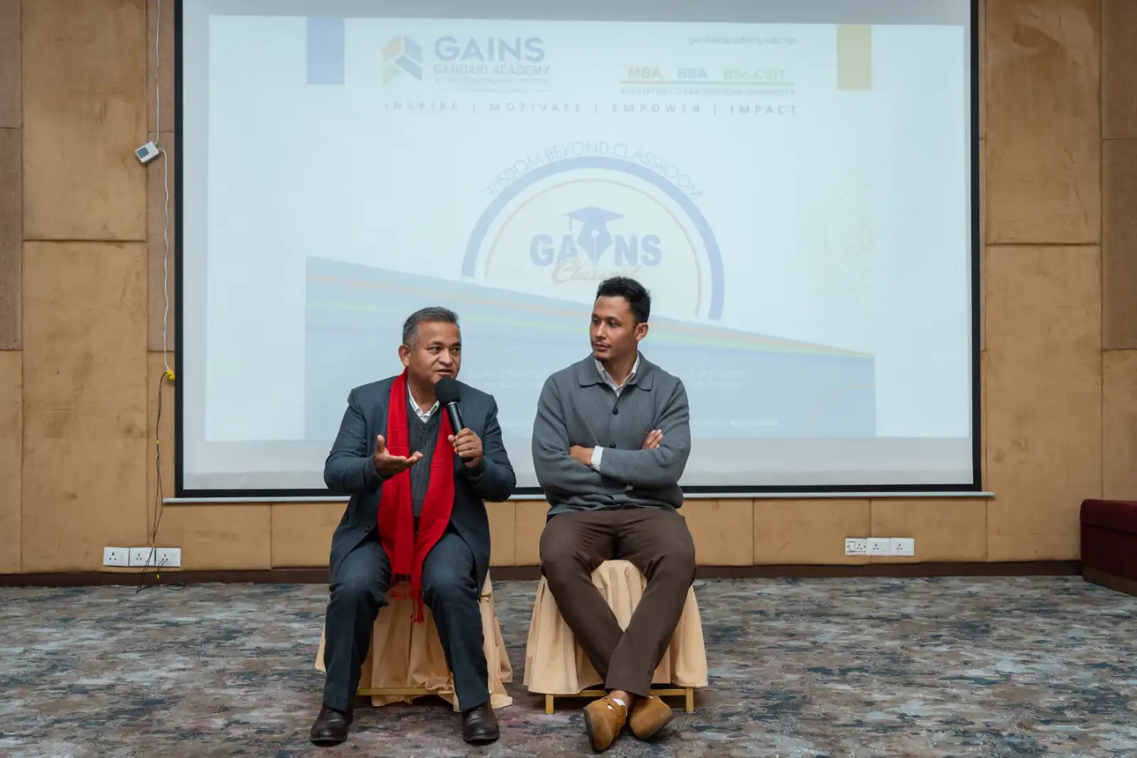 GAINS-ClassOuts is an experiential learning initiative that takes learning beyond the classroom through meaningful interaction with real-world professionals. Held frequntly, it brings together students from BBA, MBA, and BSc-CSIT programs for relaxed, conversation-based sessions. Much like a “time-out” in sports, ClassOuts offer a pause from routine classes to reflect, gain new perspectives, and re-energize learning.